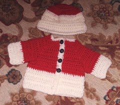 I’m pretty sure the red yarn is from a partial skein I had of Michael's store brand yarn. Went as far as I could with the red I had and finished it off with Lion Brand Pound of Love white yarn. I thought using the black buttons would at least make it look something like a Santa suit.